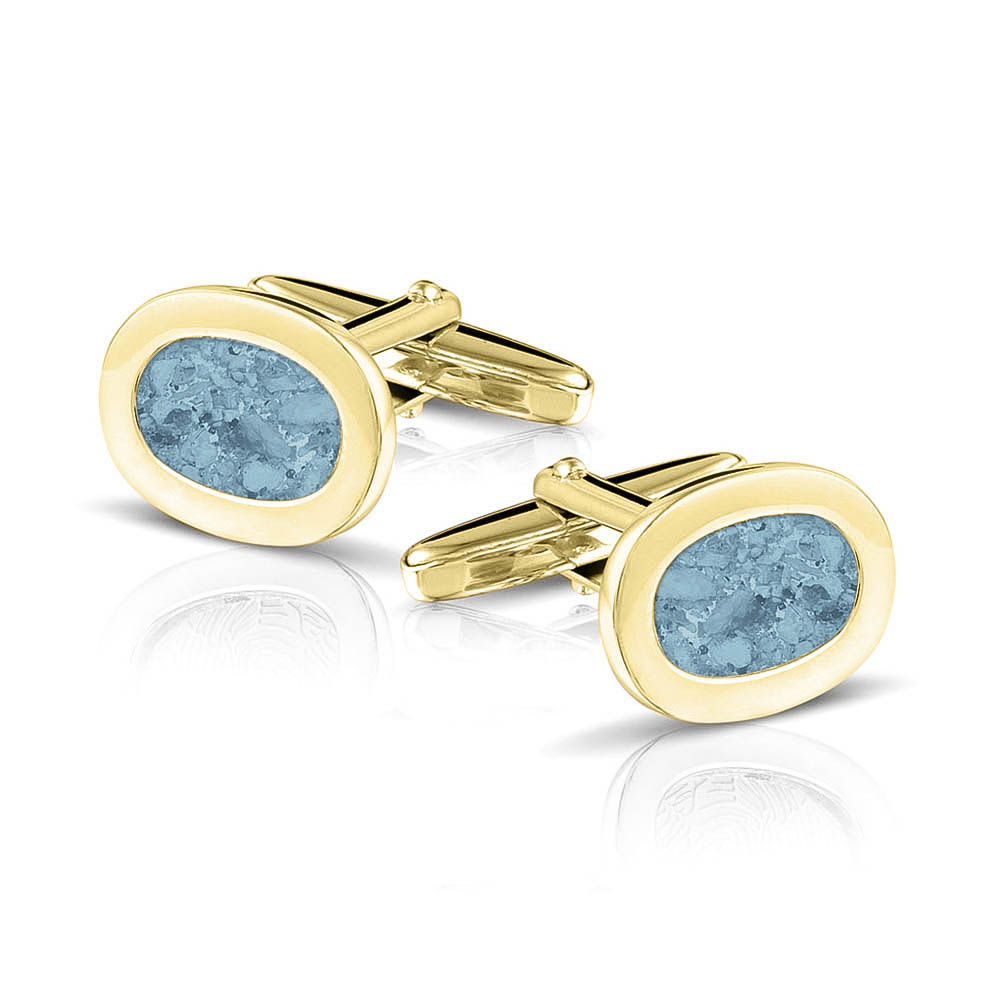 Oval cufflinks filled with ashes visibly on the top. They come per pair. The ashes is integrated into the jewelry with our special resin.