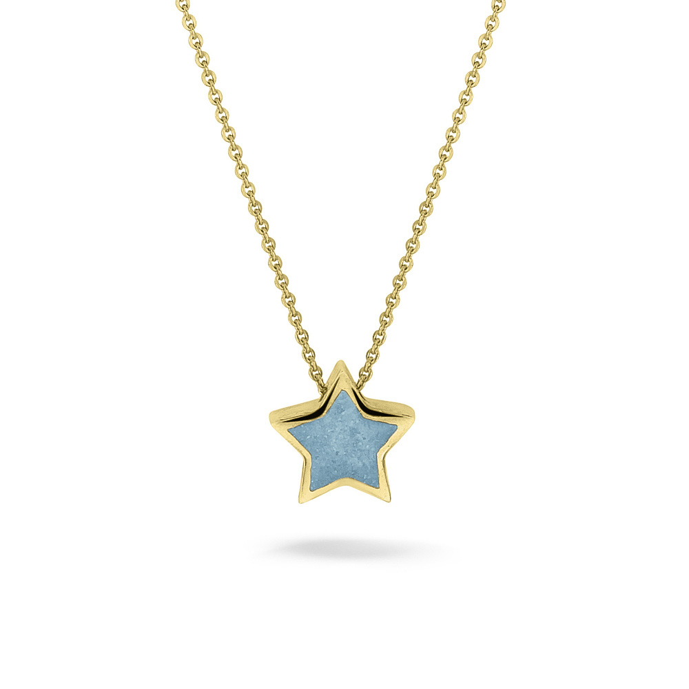 Ster hanger, inclusief collier. Het collier gaat door het sterretje heen waardoor de ster heen en weer kan bewegen. De ‘voorkant’ van het sterretje kan gevuld worden met eventueel asjes, moedermelk of haar. U kunt het sterretje met de vulling naar voren dragen of juist tegen u aan. Ook is er ruimte om een vingerafdrukje op het gladde deel van de ster te zetten. De prijs voor deze eventuele vingerafdruk is €40.