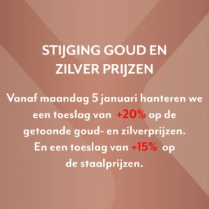 LET OP: vanaf maandag 5 januari 2026 hanteren we 20% extra op de getoonde prijzen voor de ZILVEREN en GOUDEN sieraden. De stalen ringen blijven 15% extra bovenop de getoonde prijzen.