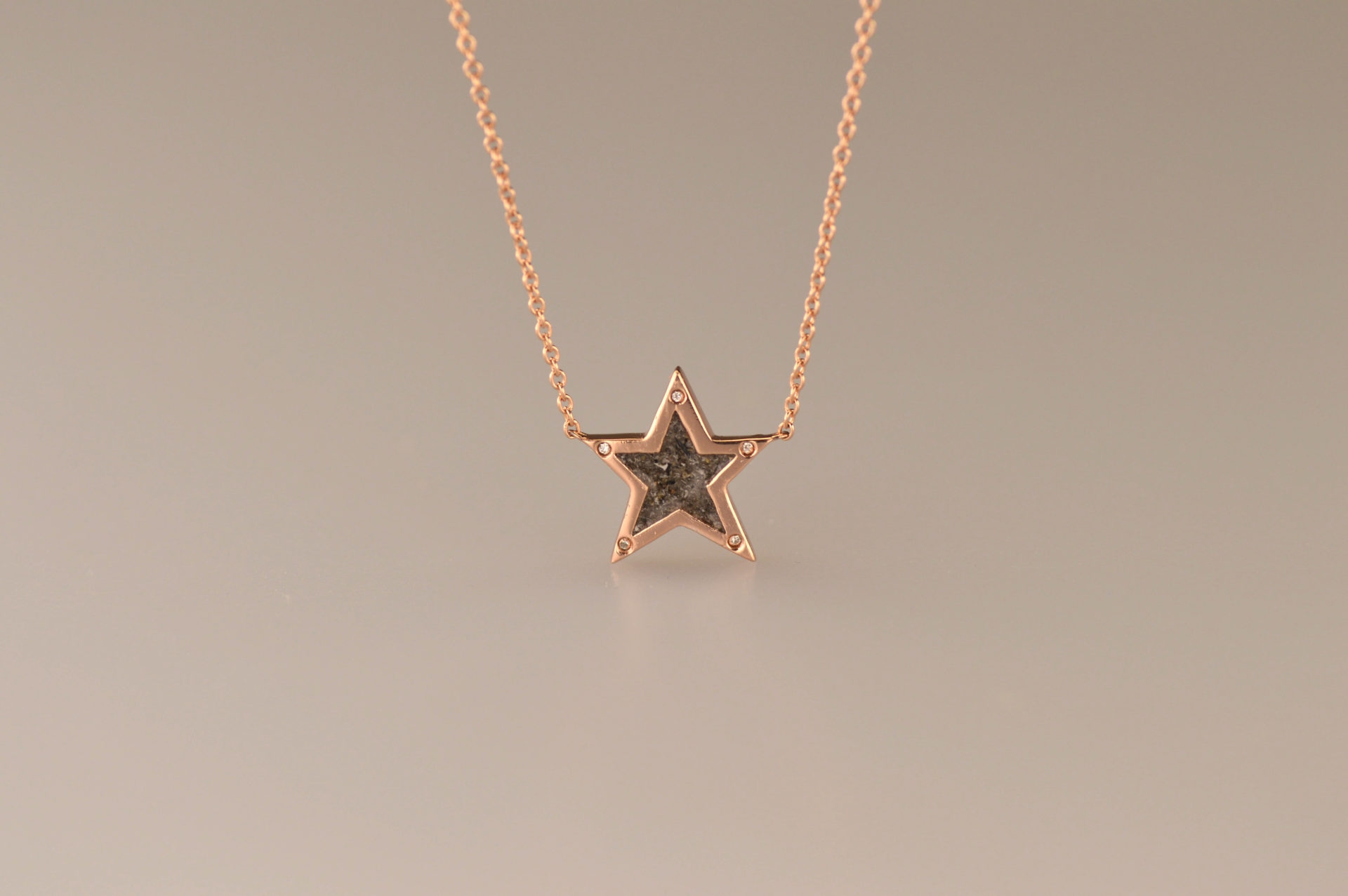 Rosé vergulde ster hanger, inclusief collier. Het collier is 42 + 3 cm lang. U kunt het collier op 42 tot 45 cm dragen door het 3 cm lange jasseron verlengkettinkje.